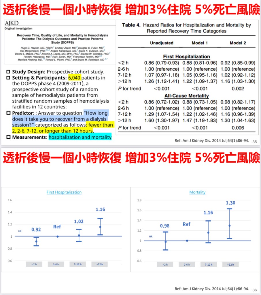2014年的美國腎臟病期刊研究發現:將腎友透析後恢復體力的時間分成四組,<2小時,2-6小時,7-12小時,>12小時;其中以2-6小時恢復體力的族群為基礎,發現需要較長時間恢復體力的另外兩組腎友,日後的住院率及死亡率都會增加,平均每延遲一個小時恢復體力,會增加3%的住院風險,以及5%的死亡風險。(如下圖)