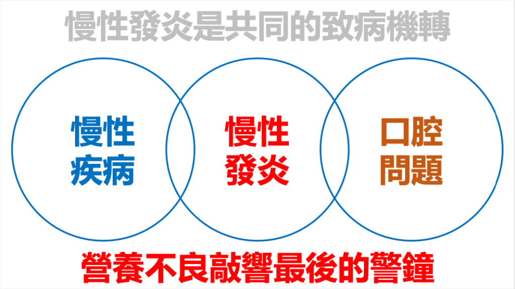 - 慢性疾病 口腔問題 慢性發炎 加起來造成營養不良