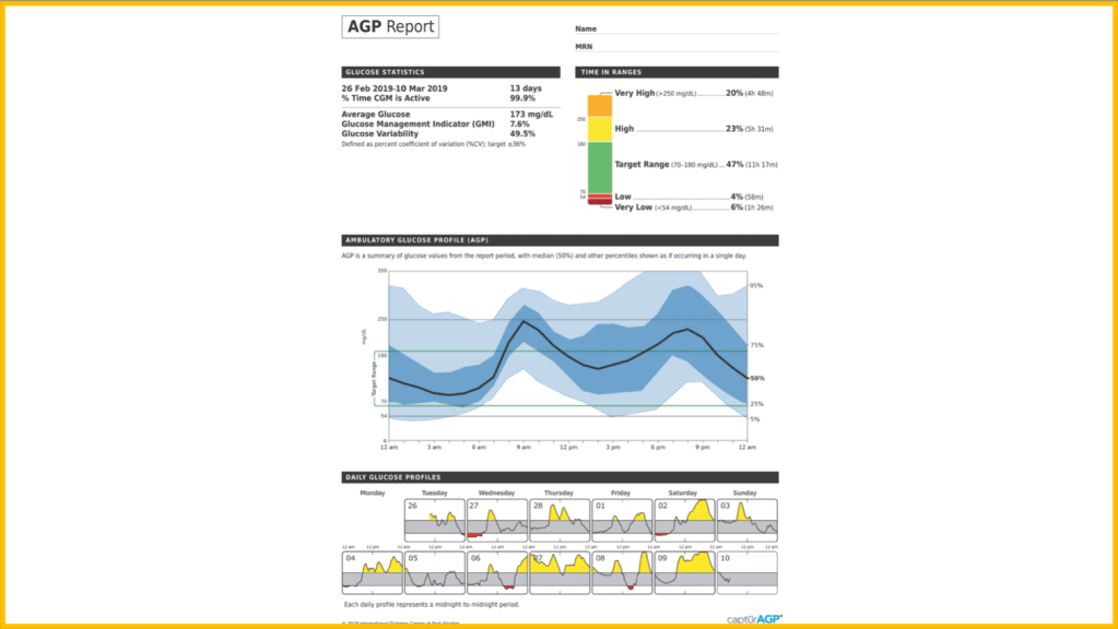 從這一部分就可以看出每個人的血糖起伏的概況,也可以先看看問題出在哪裡,評估穩定度(TIR),變異度(variability),還有高低血糖的時間點。
