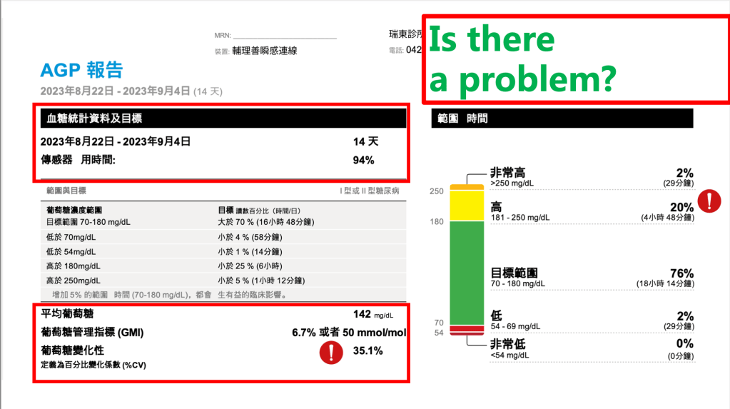 第二步:看右邊的血糖在目標範圍內時間,高低血糖分佈狀況,還有左下的GMI,與葡萄糖變異度(glucose variability,coefficient of variability= standard deviation/mean glucose concentration)(最好小於36%)。