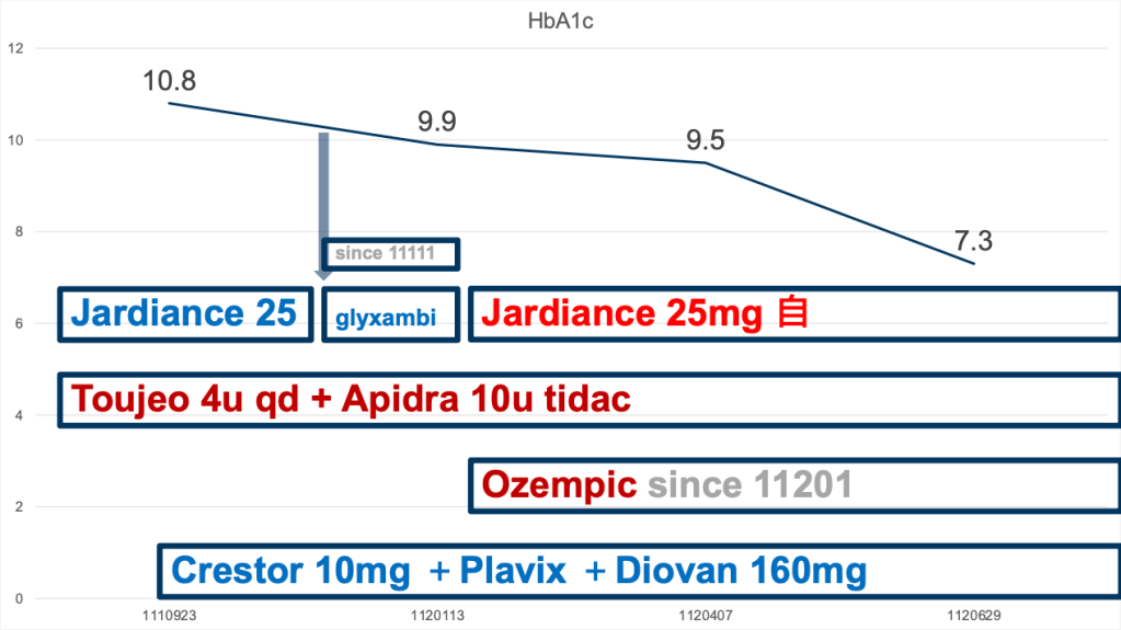 According to close monitor of SMBG, not much improved glucose level was obtained, therefore, GLP1 RA was initiated, with glyxambi shifted to Jardiance concurrently, together with the use of insulin. Subsequent improvement of HbA1c was noted after medicine adjustment mentioned above, with careful titration of insulin dosage.