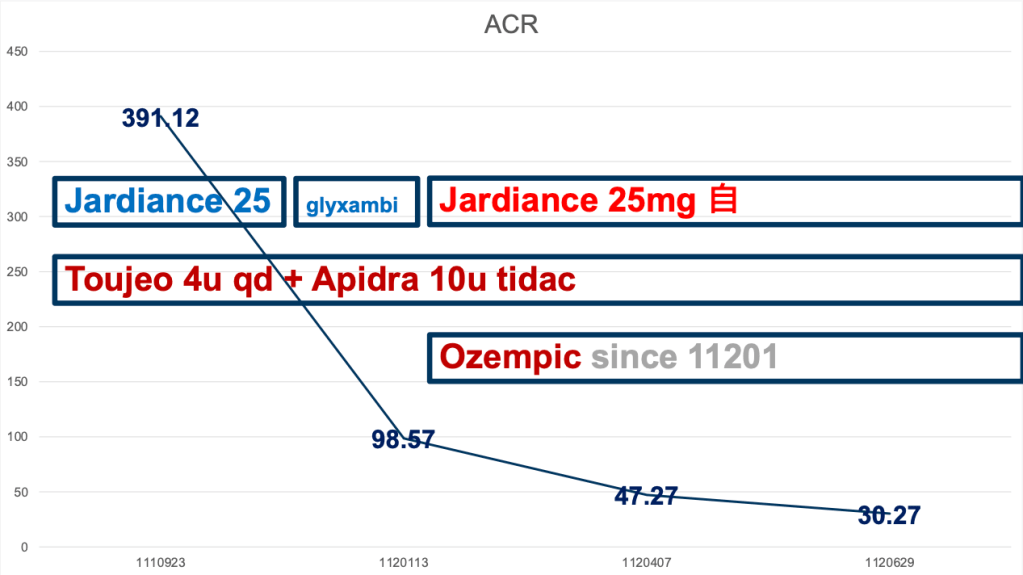 Improvement of urine ACR was noted during the course of treatment, which could be attributed to improvement of glucose control and renal protective agent usage, including SGLT2 i and GLP-1 RA.