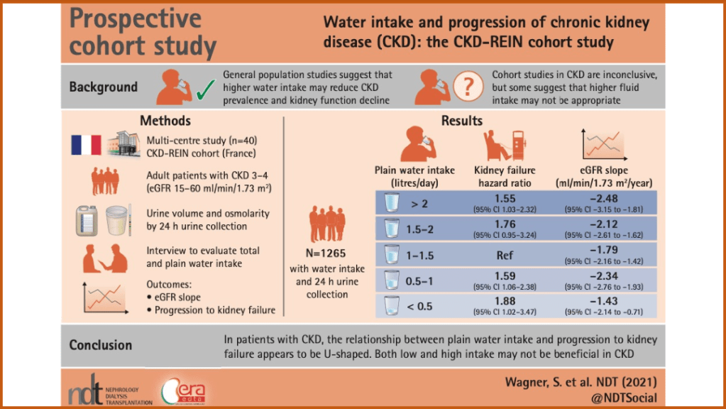 研究方法:透過訪問的方式,了解1265名研究對象的喝水量,搜集24小時尿液的總量,並檢測尿液的滲透壓。追蹤分析喝水量對腎功能下降的速度,以及腎衰竭風險的影響。