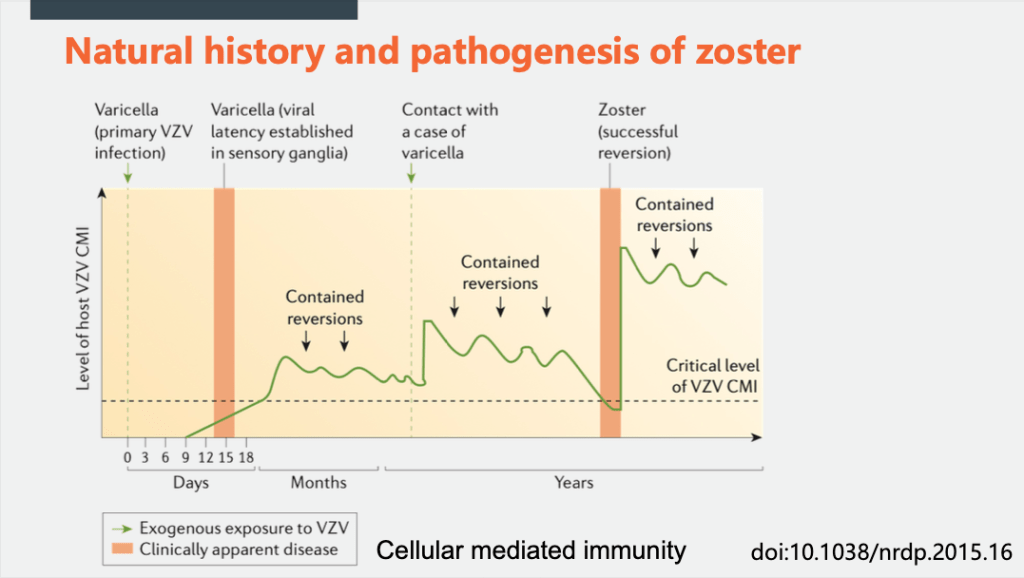 免疫力下降時(低於虛線),帶狀疱疹就會復發。