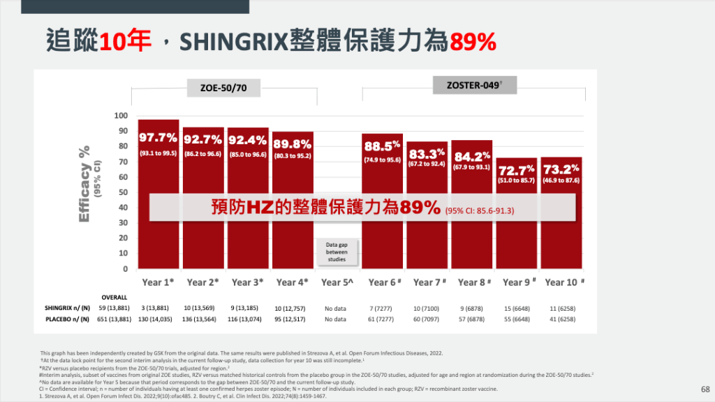 新型的非活性,基因重組,帶狀疱疹疫苗,欣剋疹,具有優異且持久的保護力,10年仍有近90%的保護力。