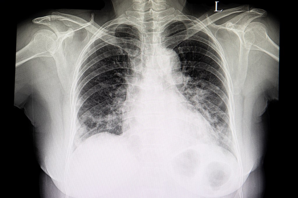心臟兩側白白毛毛,像棉花的樣子,以心臟為中心,散布在兩側肺部的是水腫的肺部。