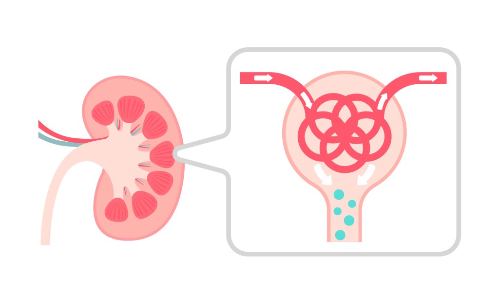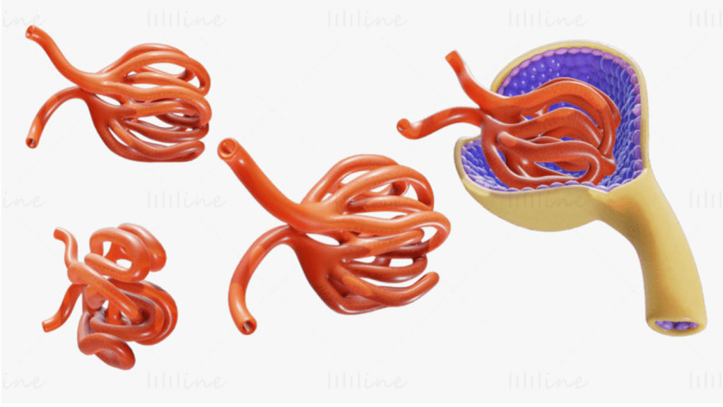 (腎動脈進入腎臟後,逐漸分支,由入球小動脈進入腎絲球,進入腎絲球的血管是具有單層內皮細胞的微血管,腎絲球的微血管纏繞成球狀,負責過濾流經的血液,擠成球形的腎絲球內圍由繫膜細胞 Mesangial cell 所支撐著,球體外部被鮑氏囊包覆,負責收集經過腎絲球初步過濾出來的液體)