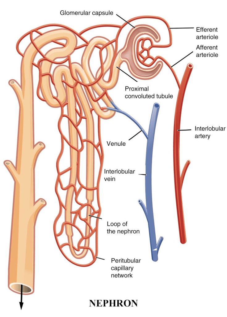 上圖為一個腎元的卡通圖:圖中可以看到腎絲球,鮑氏囊,集尿系統,與血管系統,支持與調節系統並未畫出來。
