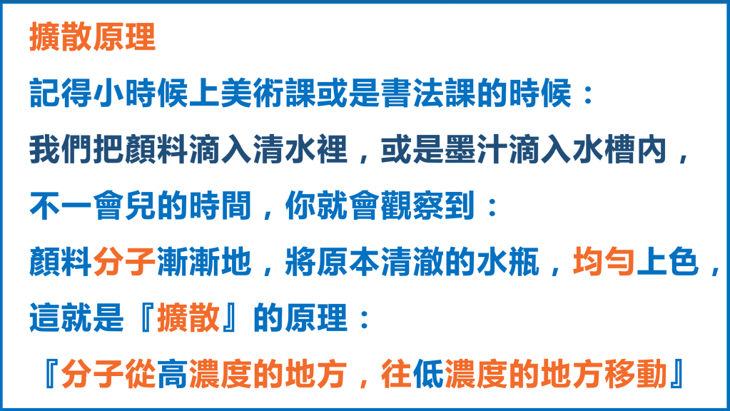 經過每次四個小時的透析,血液與透析液之間,半透膜兩邊可穿透物質的濃度,將藉由擴散達到平衡。