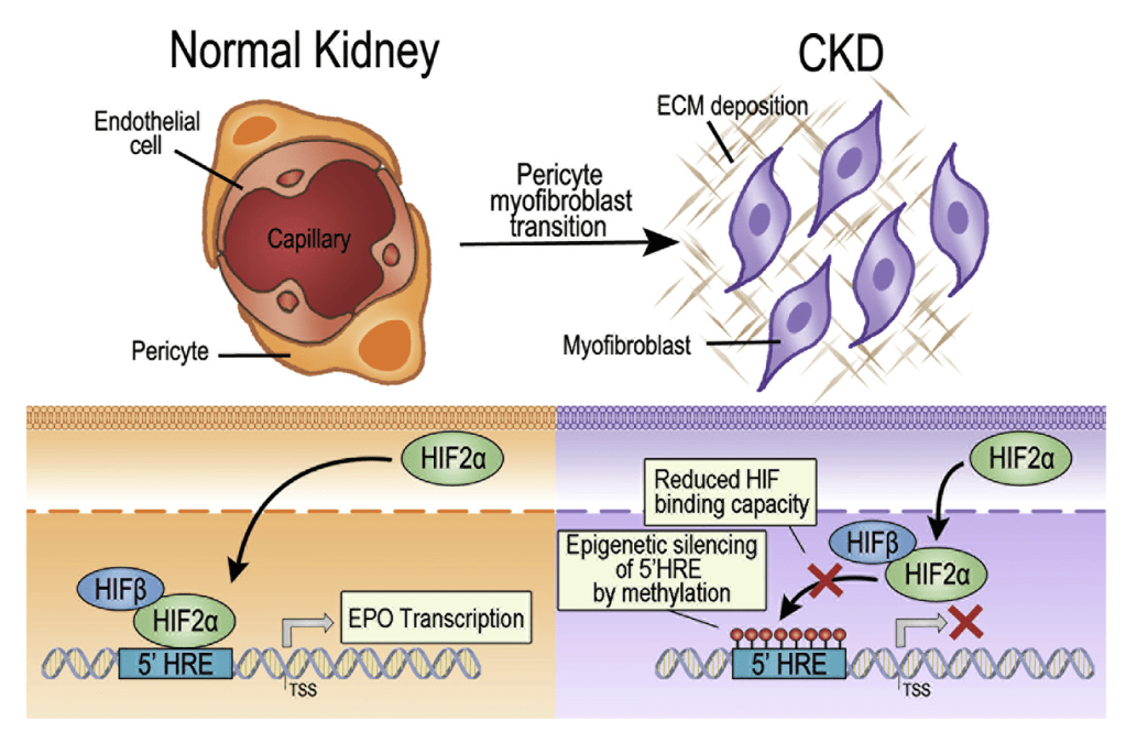 下圖的上半部為:左邊正常腎臟的外被細胞(pericyte),轉化為右側的肌纖維母細胞與間質沉積的示意圖。肌纖維母細胞製造紅血球生成素的能力遠低於正常的外被細胞。