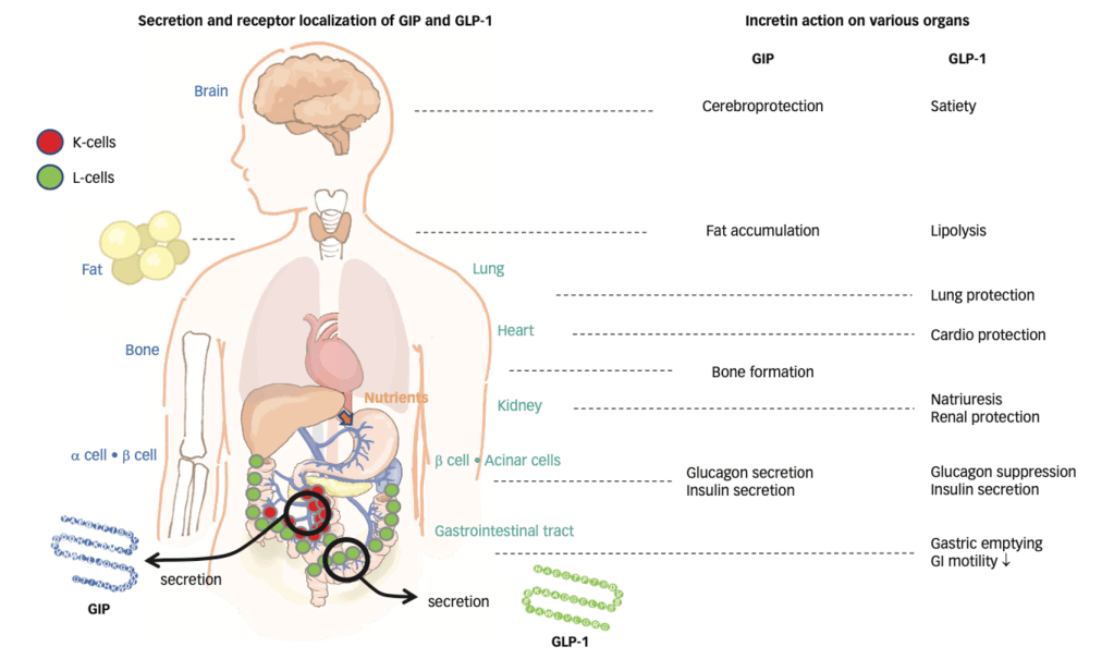 2. GIP:glucose-dependent insulinotropic polypeptide,葡萄糖依賴胰島素刺激胜肽,則是由近端小腸,即 duodenum(十二指腸)與upper jejunum(空腸)上的 K-cell 所分泌;分泌出來的 GIP 跟 GLP-1 一樣,兩者都會被 DPP-4 enzyme 分解,血中半衰期只有 5-7 分鐘;之前並沒有單獨針對此賀爾蒙作用的藥物上市,今年(2025)在台灣上市的 Mounjaro(猛健樂)是單一分子,具有雙重效果,同時針對 GLP-1 receptor GIP receptor(receptor: 受體)作用的皮下注射針劑藥物(一週一次)。