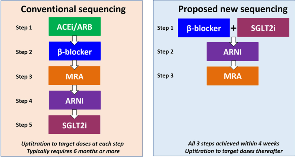 上圖左側為傳統的加藥順序,每一種藥物加到最大耐受劑量,在進展到下一種,通常要6個月以上;上圖右側為近年最新的觀念與做法:分成3個步驟,4周內將四種藥物都用上,且用到最大耐受劑量。